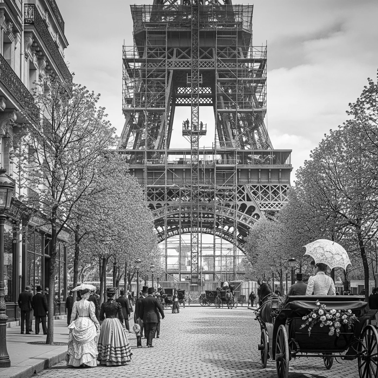 「description」: "This black-and-white photograph captures the exterior of Café des Fleurs, a Parisian café on a street corner in the 1950s. The Eiffel Tower is visible in the background, and people enjoy coffee on the outdoor terrace. The street captures a quiet moment just before sunset.