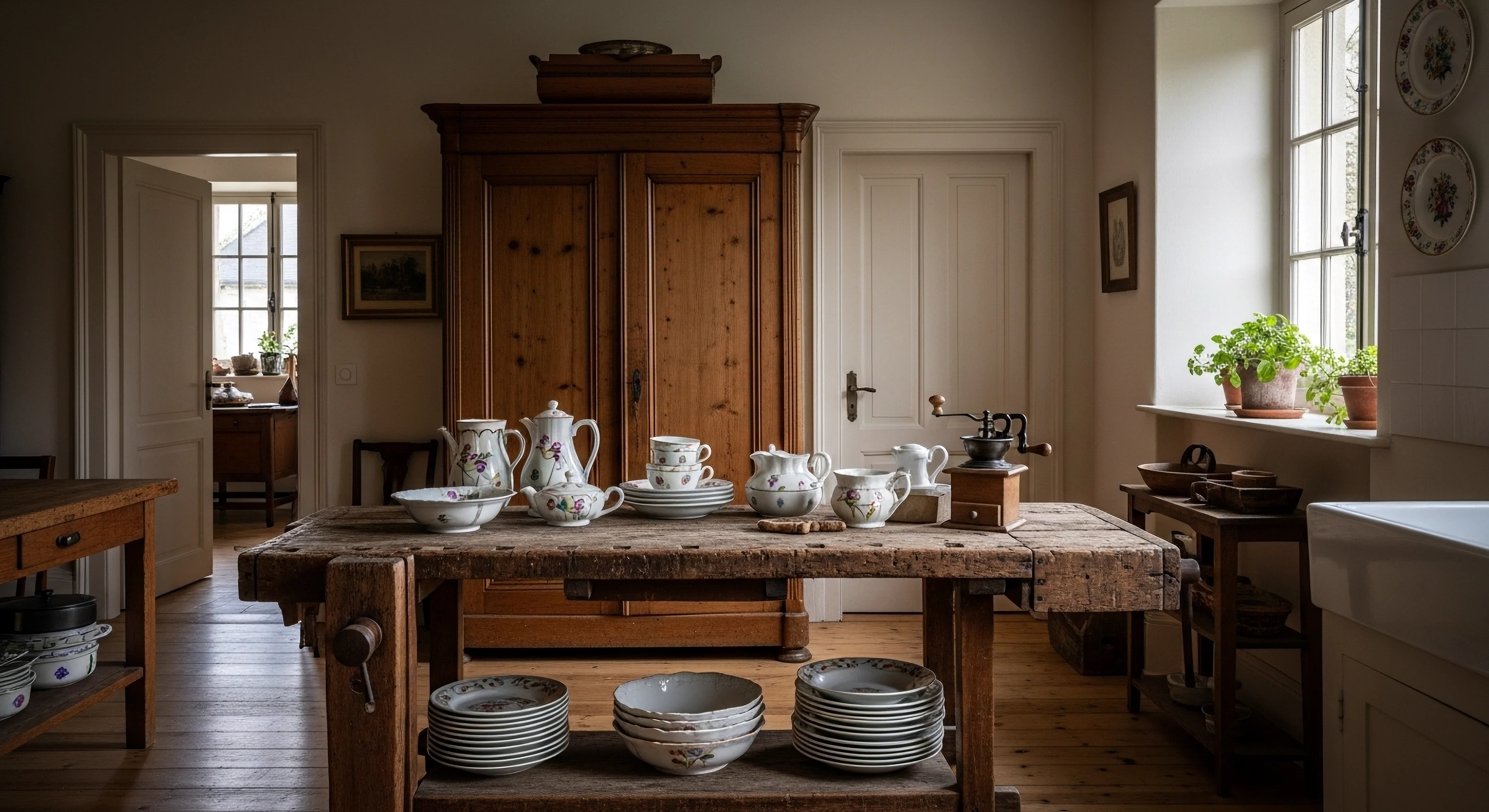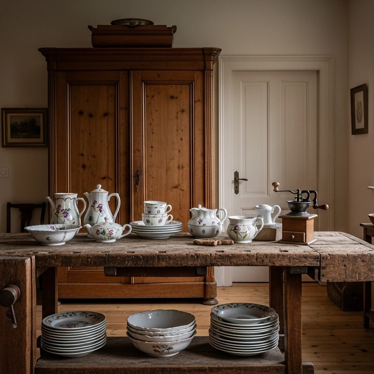 Foreground: a worn farmhouse worktable in dark aged wood (#5A4632), partially cropped at the bottom edge for intimacy and realism. Table surface sharply in focus, showing fine grain, scratches, and patina. On the table, carefully styled stacks of Limoges and Sèvres porcelain (#F8F8F6) with delicate floral details, arranged asymmetrically for editorial balance, alongside a vintage manual coffee grinder in dark wood (#3B2E23) and burnished metal (#7A6A58).