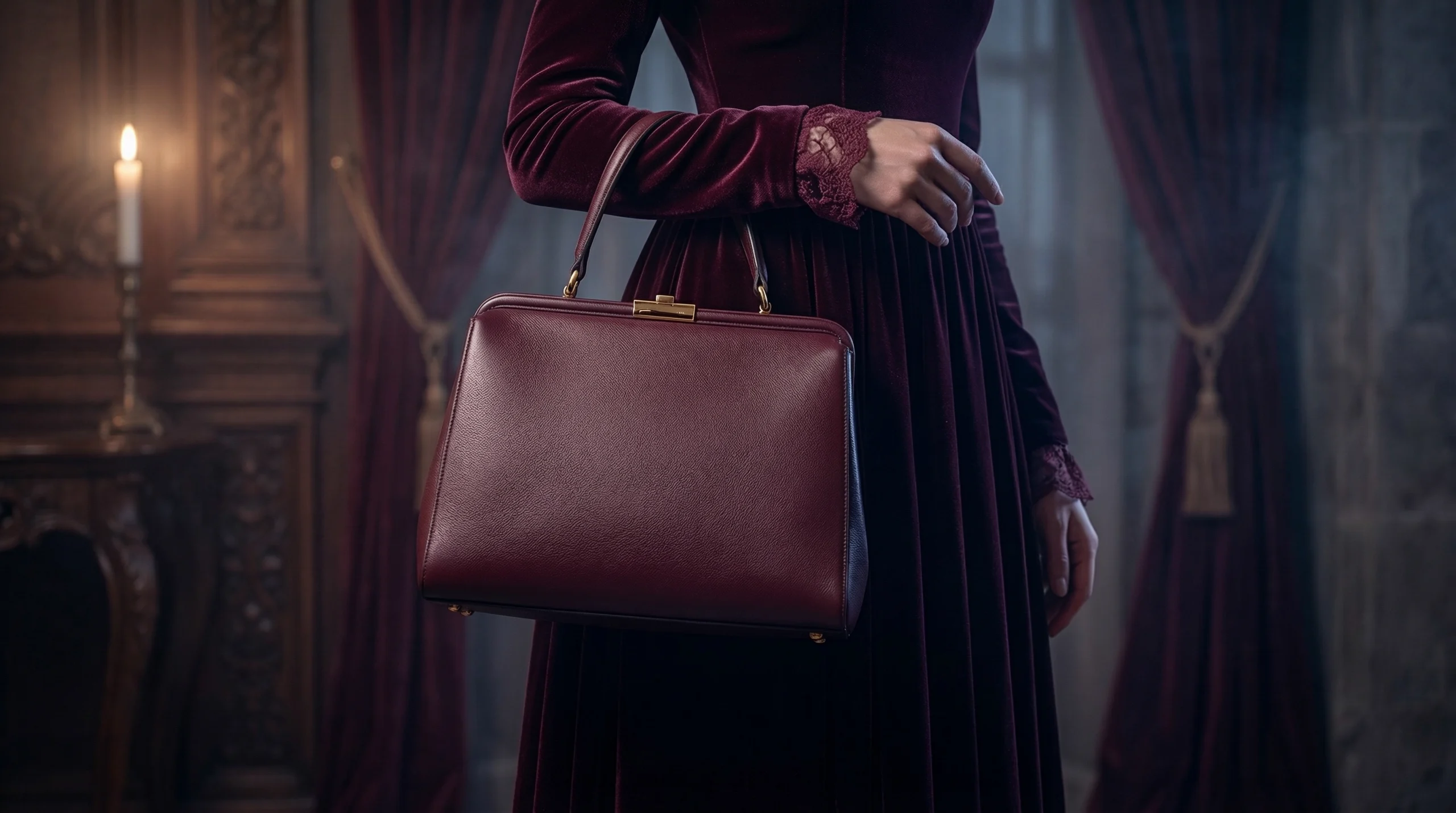 "example_prompt_assembly": "(masterpiece, best quality, ultra-detailed:1.2), high-fashion photography, (dramatic chiaroscuro:1.3), (rich deep wine red velvet dress:1.35), (subtle blue undertone:1.2), single-handle luxury leather handbag, (elegant structured silhouette:1.25), polished gold hardware reflecting candlelight, moody Baroque library, volumetric fog, sophisticated melancholy, medium close-up, tactile contrast between plush velvet and smooth leather, gothic noir, classic oil painting aesthetic"